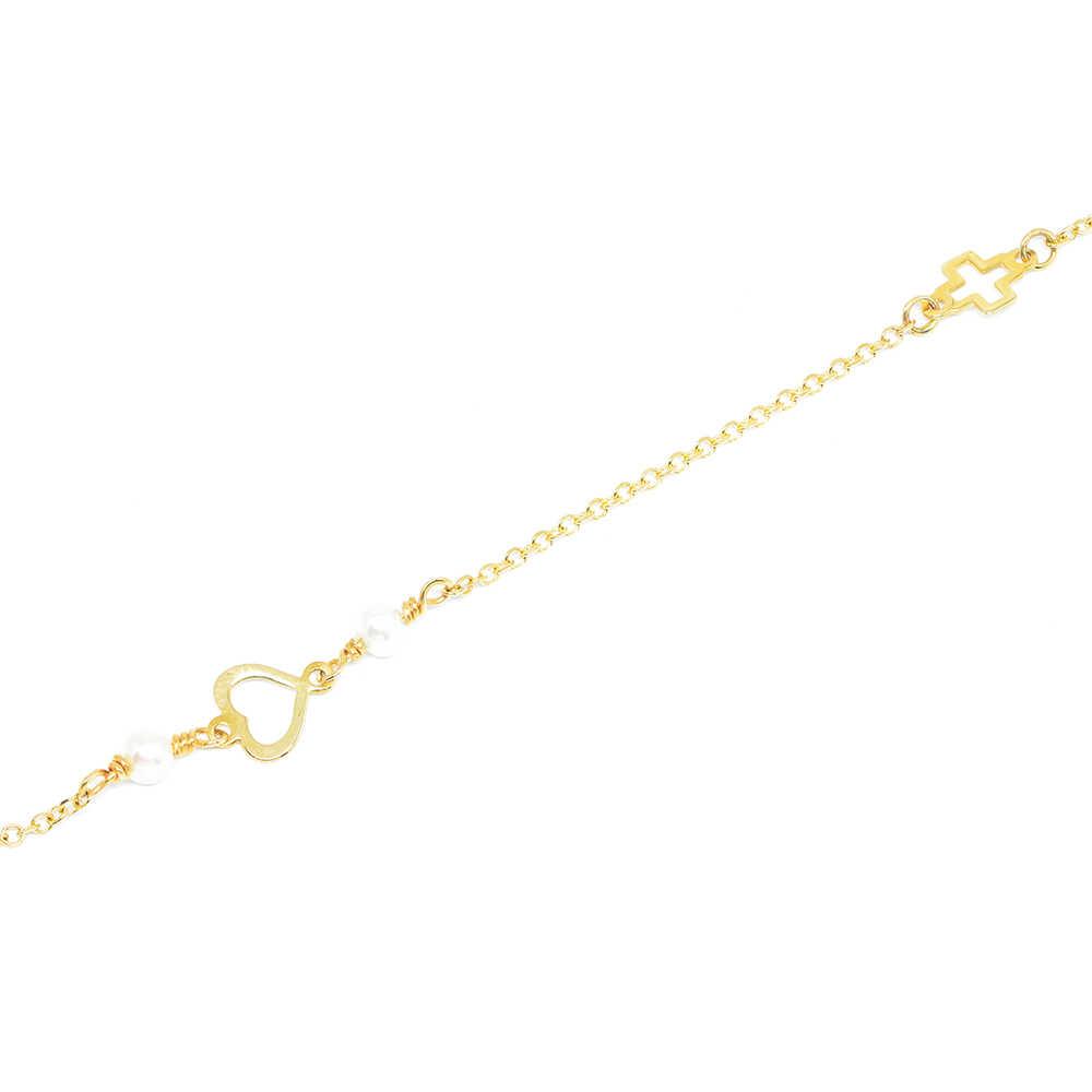 Bracelet with a chain and wonderfully cute detail with a cross, heart and natural pearls. Ideal for girly chic looks