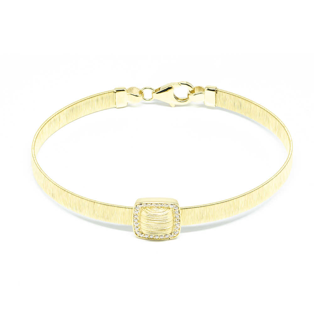 14k yellow gold fixed bracelet with a unique matte satin finish, classy design and square motif with cubic zirgons. A wonderful timeless bracelet that will accompany you in your all day chic looks and will make you stand out.