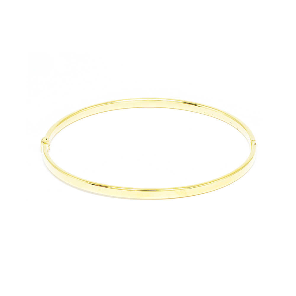 Fixed bangle bracelet made of K14 gold in a squared flat shape with a modern removable design and a clasp on the side. Ideal for everyday minimal chic looks.