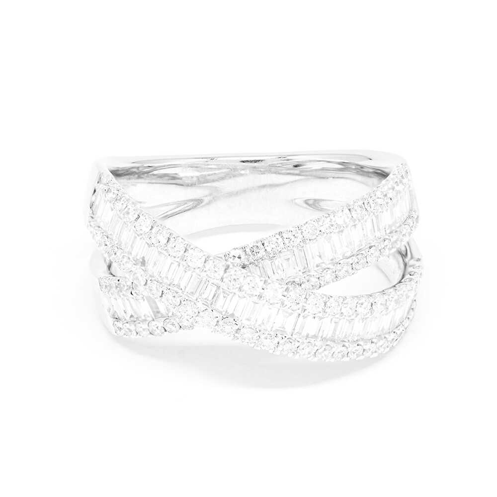 K18 white gold diamond ring in a classy design with brilliant cut diamonds and baquettes. A special choice and a jewel-investment of unique aesthetics for timeless appearances. Diamonds total 1.25 ct.