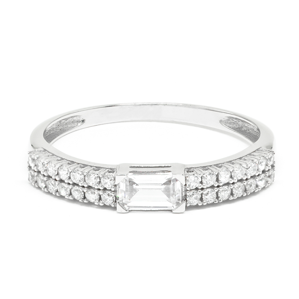 K14 white gold series ring in an extremely timeless design with shiny cubic zirgons in pave studding and a sophisticated zirgon baguette detail in the center. Ideal for unique and impressive everyday appearances. Wedding collection.