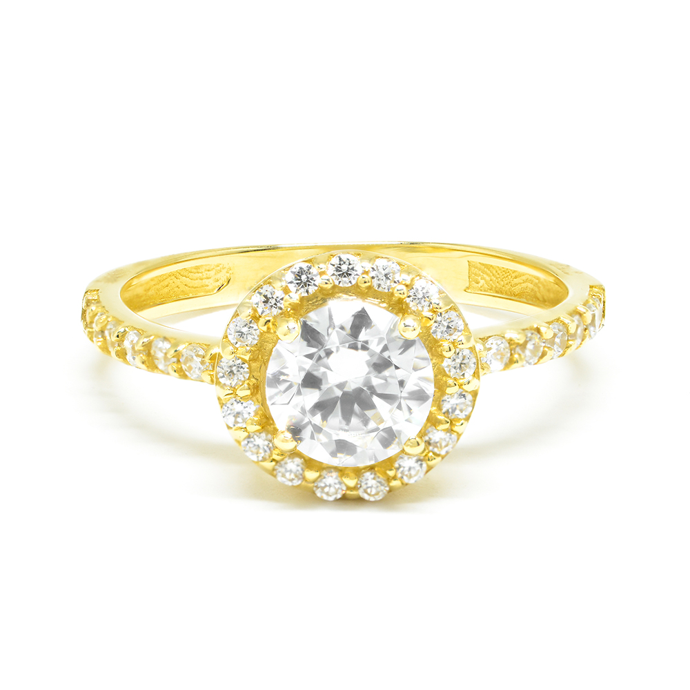 Single stone ring in 14k yellow gold in a uniquely impressive design with cubic zirgon and wonderful sparkling details of zirgons surrounding the center stone. A symbolic piece of jewelry ideal for glamorous timeless looks. Wedding Collection