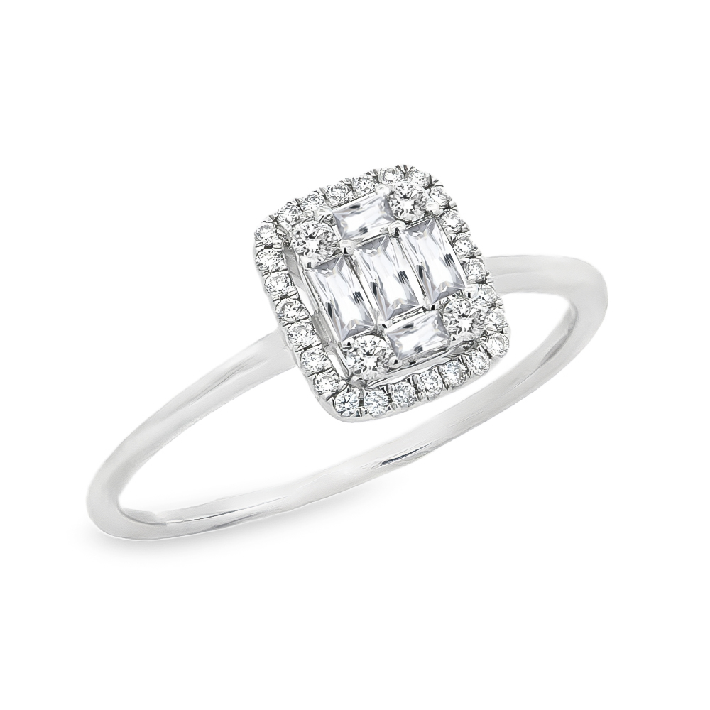 Single stone diamond ring made of white gold in an impressive frame decorated with diamonds and invisible studding in the shape of an emerald. A symbolic jewel of eternal value that stands out for its excellent design and its uniquely aristocratic style. Diamonds total 0.35ct