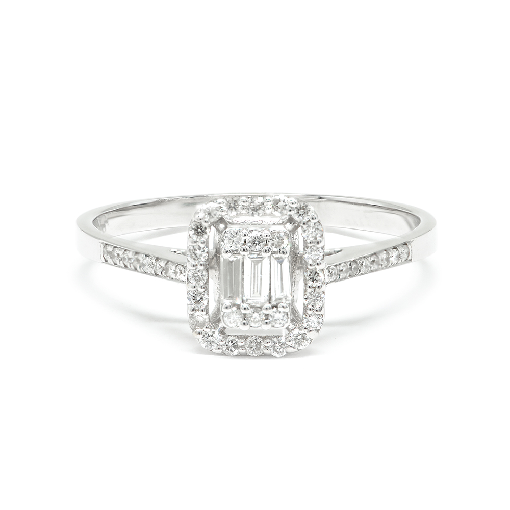 One-stone diamond ring in white gold in an impressive frame decorated with diamonds and an invisible stud in the shape of an emerald with baguette and brilliant cut diamonds. A symbolic jewel of eternal value that stands out for its excellent design and its uniquely aristocratic style. Diamonds total 0.11ct
