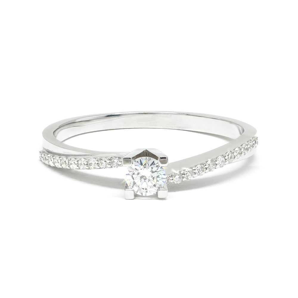 Single stone diamond ring in white gold in an elegant classic design with a brilliant cut diamond and elegant diamond details adorning the sides. A symbolic jewel of eternal value distinguished by its sophisticated design. 1Diamond 0.10ct Diamonds total 0.15ct. Wedding Collection