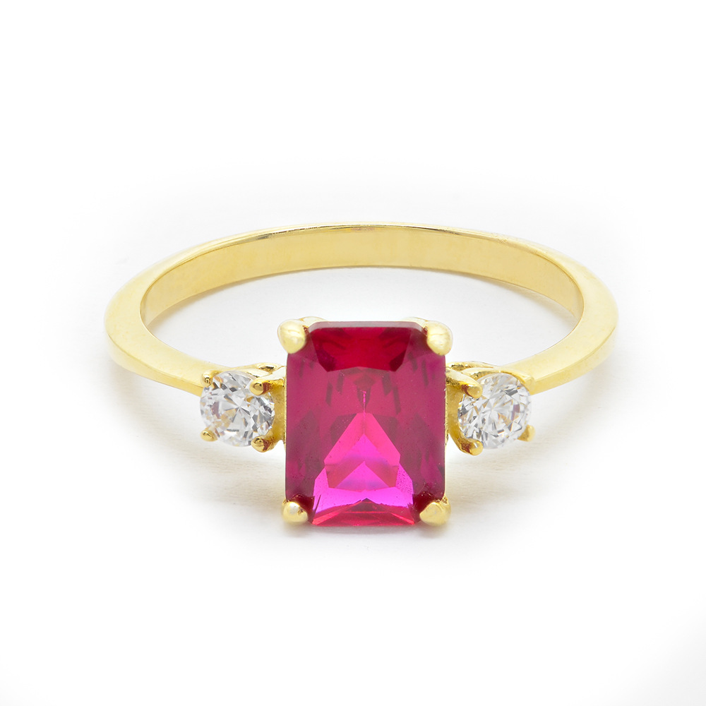 Single stone ring in yellow gold K14 in a uniquely classy design with a large green zirgon in emerald cut and excellent details on the side of shiny zirgons. A symbolic piece of jewelry ideal for unique and timeless appearances. Wedding collection