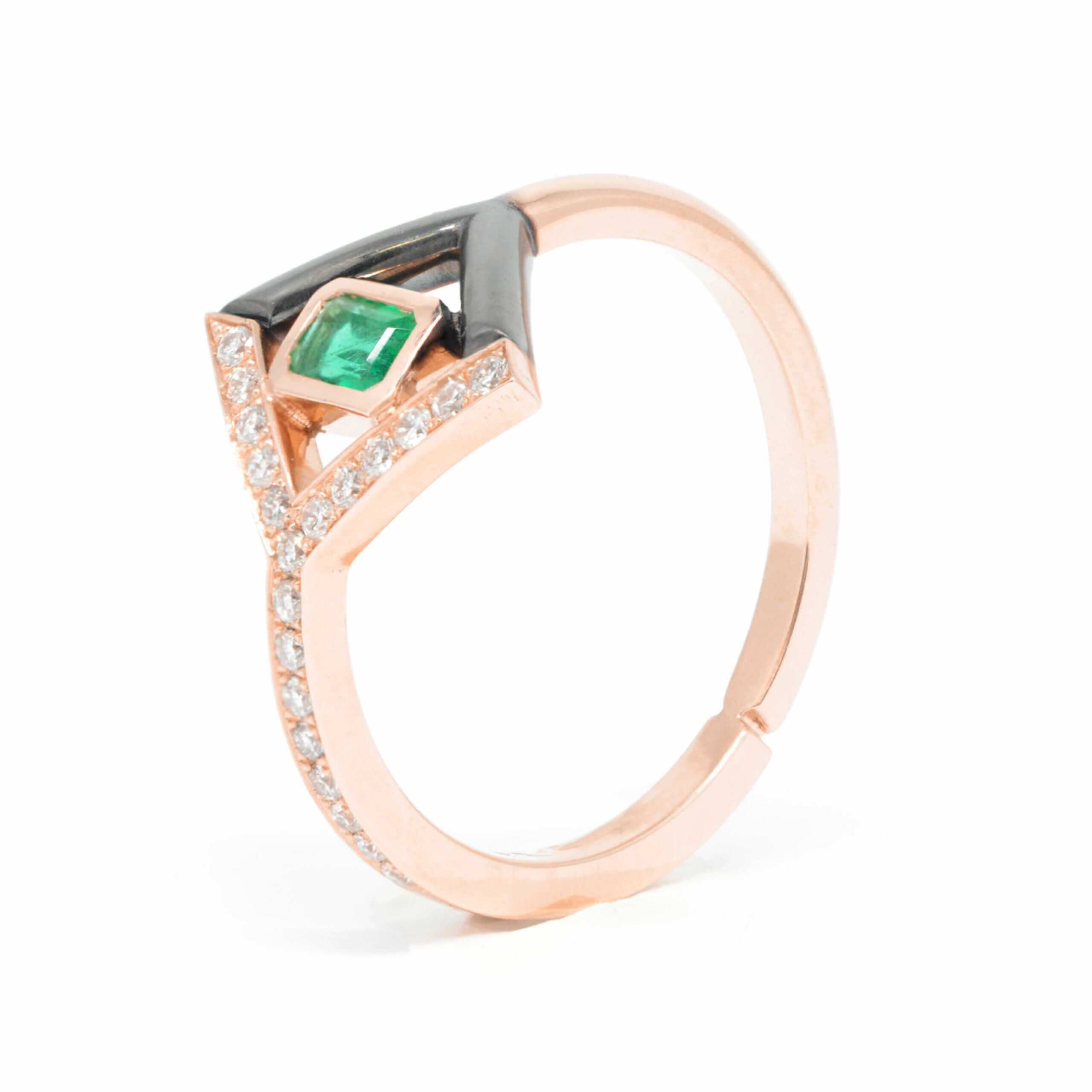 Shiny rose gold ring in a uniquely impressive design with diamonds, green emerald and black onyx. A wonderful piece of jewelry in a geometric design ideal for minimal chic looks. Brilliants total 0.17ct, emerald 0.22ct