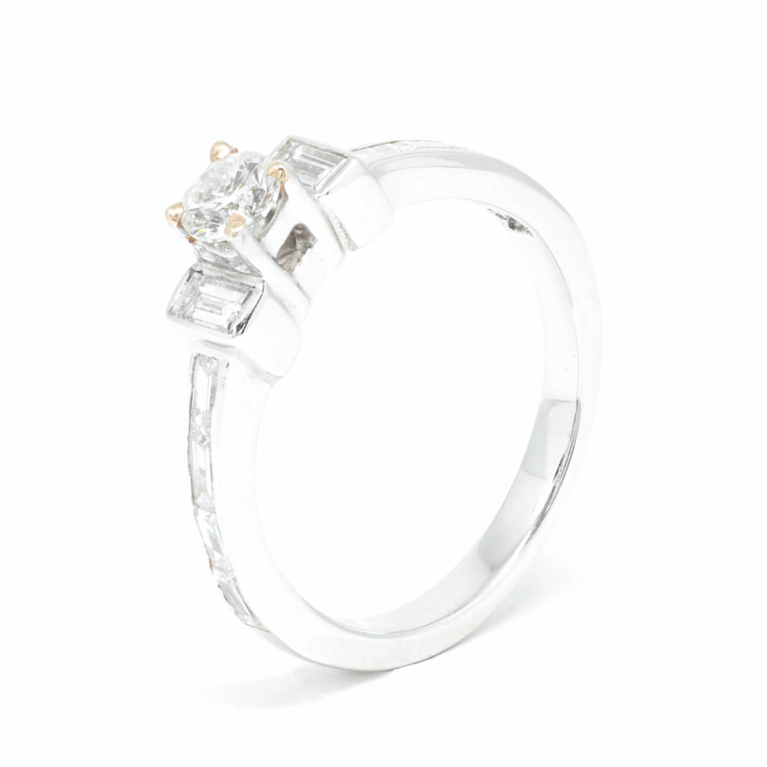 Single stone ring. Single stone with brilliant-cut diamond and ring – frame adorned with smaller baguette-cut diamonds. 1 Brilliant :0.30ct Clarity: VS2 Colour: F . Baguettes: 0.49ct