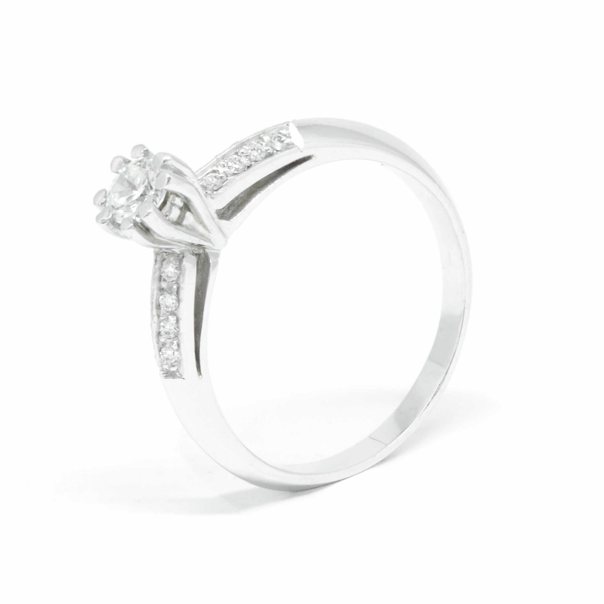 Single stone ring. Single stone with a brilliant-cut diamond and ring – framework adorned with smaller brilliant-cut diamonds. 1 Brilliant :0.25ct Clarity :VS1 Color :G.Remaining Brilliants :0.08ct