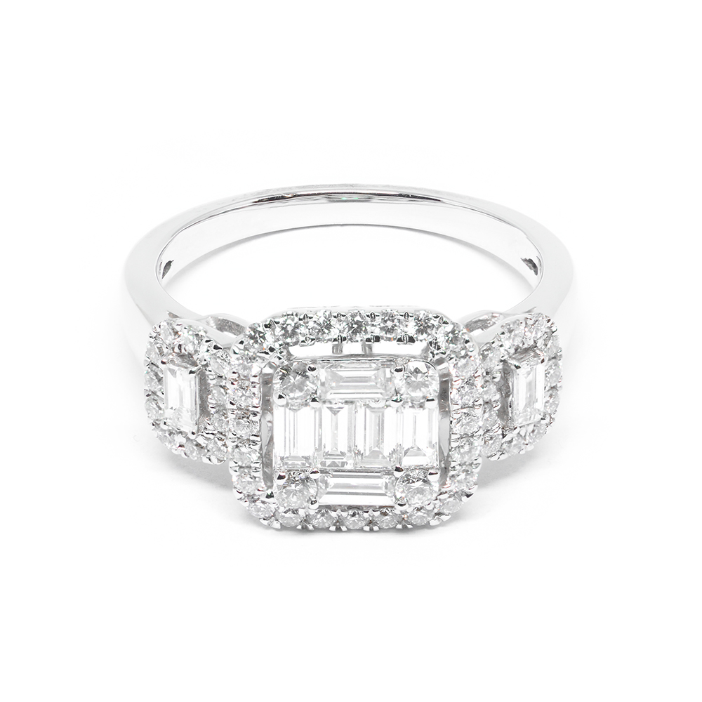 Square ring with baguette-cut diamonds and brilliant made of K18 white gold in a very impressive and classy design. A piece of jewelry in a sophisticated rectangular shape with a unique aesthetic for timeless appearances. Diamonds total 1.05ct.