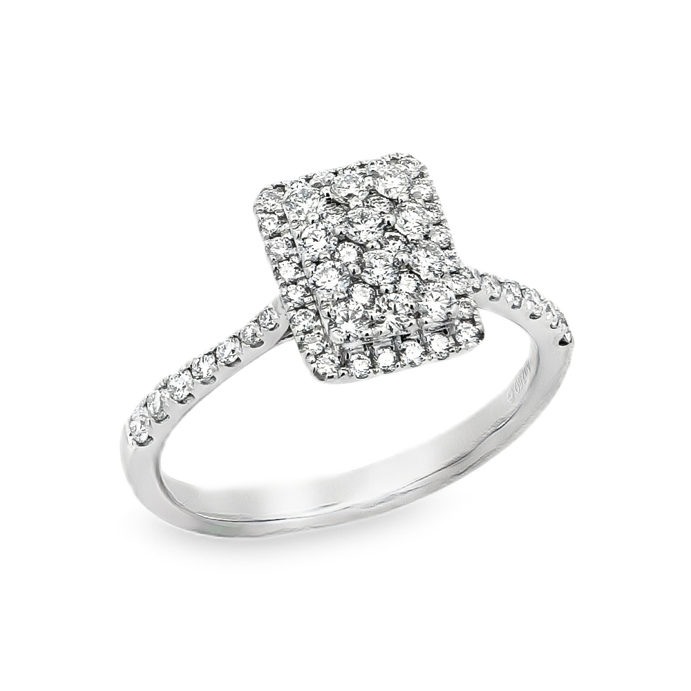 Ring in invisible nailing with baguette and brilliant cut diamonds in K18 white gold and a very impressive and classy design. A jewel in a sophisticated emerald shape with a unique aesthetic for timeless appearances. Diamonds total 0.64ct.