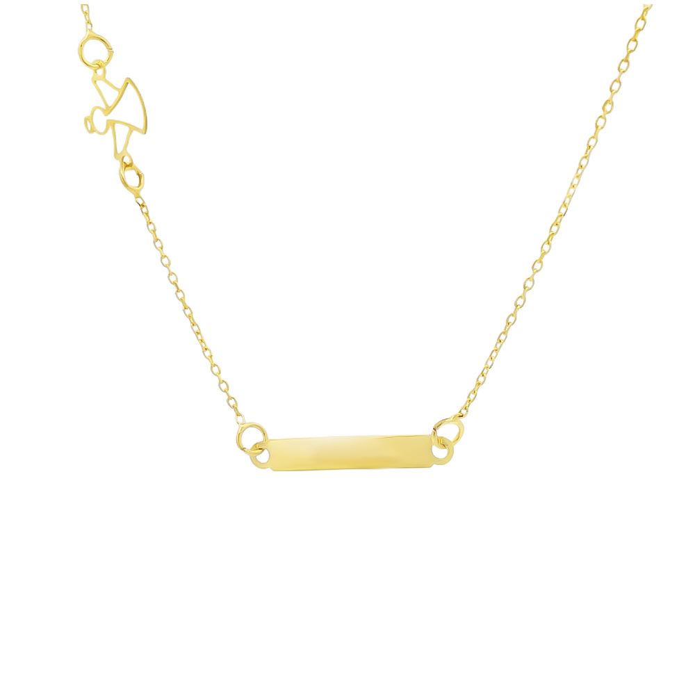 Necklace made of yellow gold K14 with chain and barrette in the middle suitable for engraving. It is distinguished by its girly angel detail. Ideal for timeless and urban chic looks.