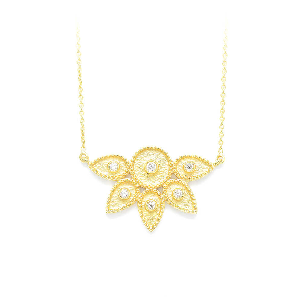 Necklace with chain handmade matte from K18 yellow gold with brilliant cut diamonds in a uniquely elaborate design of timeless aesthetics with ancient Greek references. Ideal for evening elegant chic and all time classic looks. Wedding Collection.