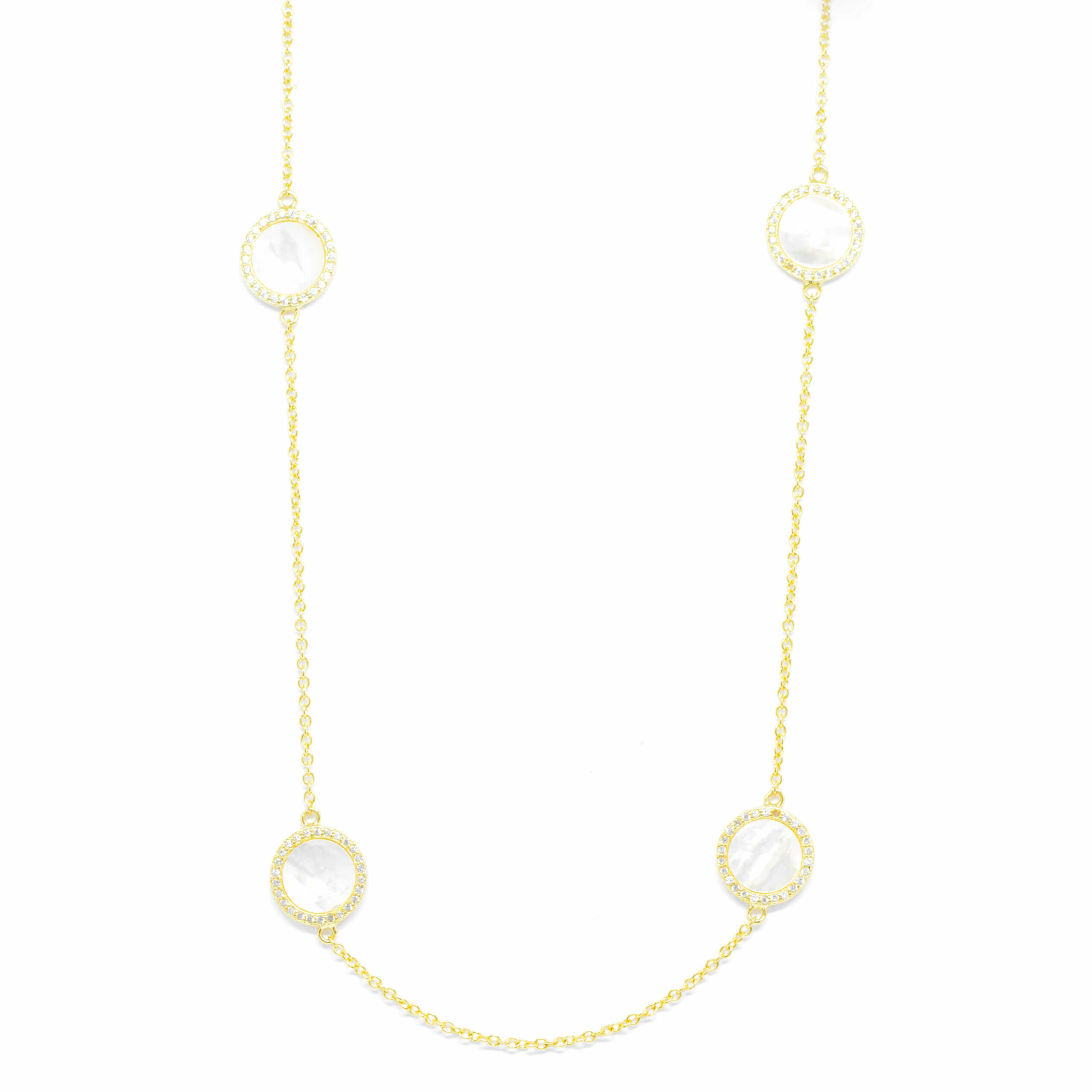 Long necklace made of silver 925 in yellow gold plating K18 with repeating motifs of mother of pearl and cubic zirgonium. Ideal for elegant chic looks from morning to night..