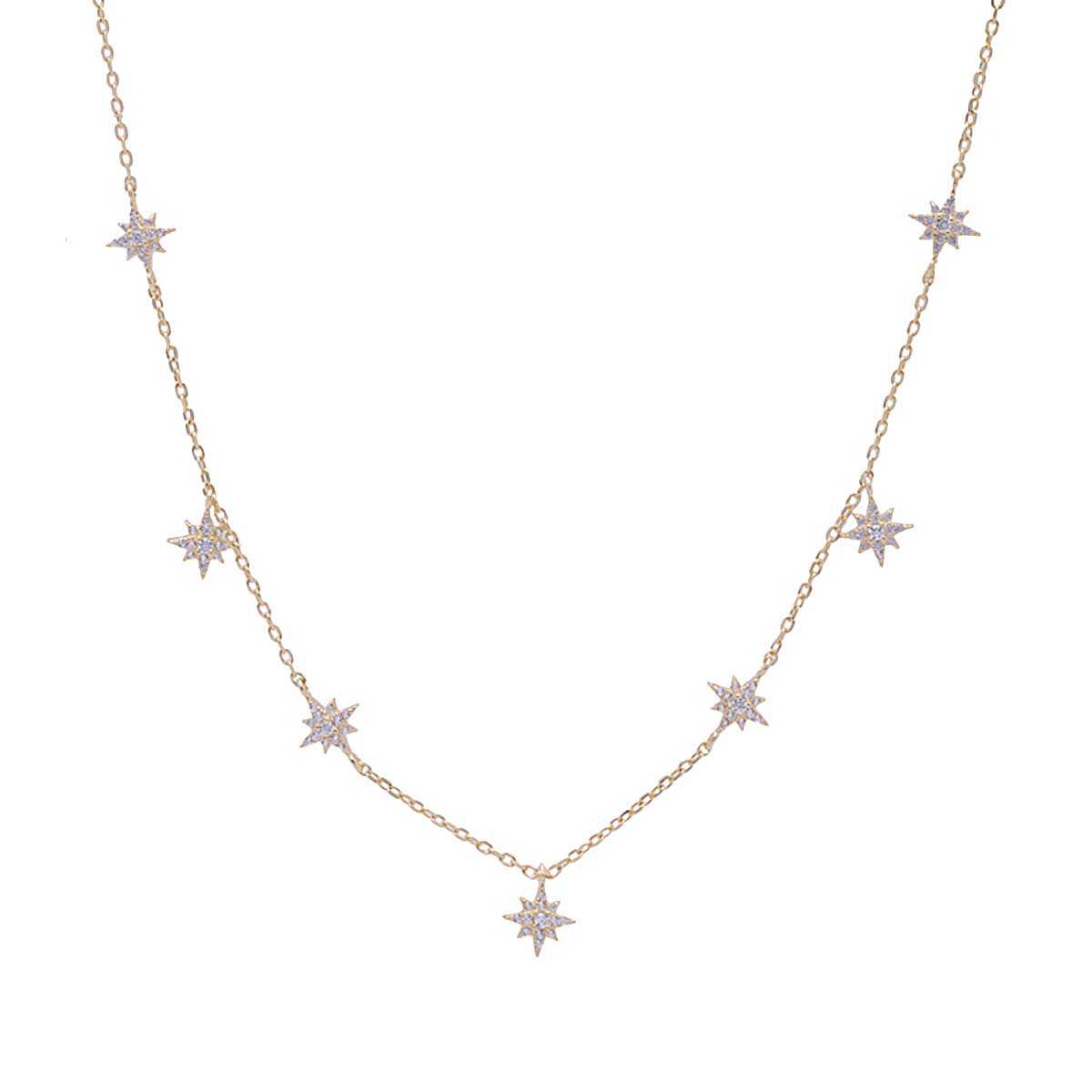 Sterling silver necklace with repeating star motifs with cubic zirgons and K18 yellow gold plating. A jewel with wonderful sparkles for all day chic feminine looks.