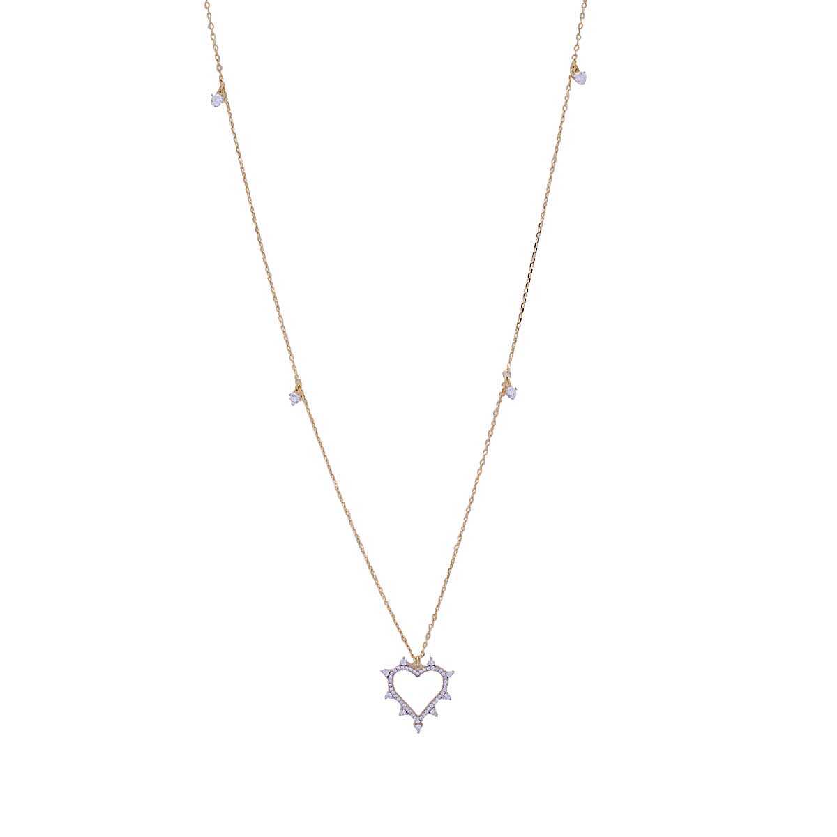 Silver necklace with long chain and heart motif decorated with cubic zirgons and K18 yellow gold plating. A jewel with wonderful sparkles for urban chic and girly looks.