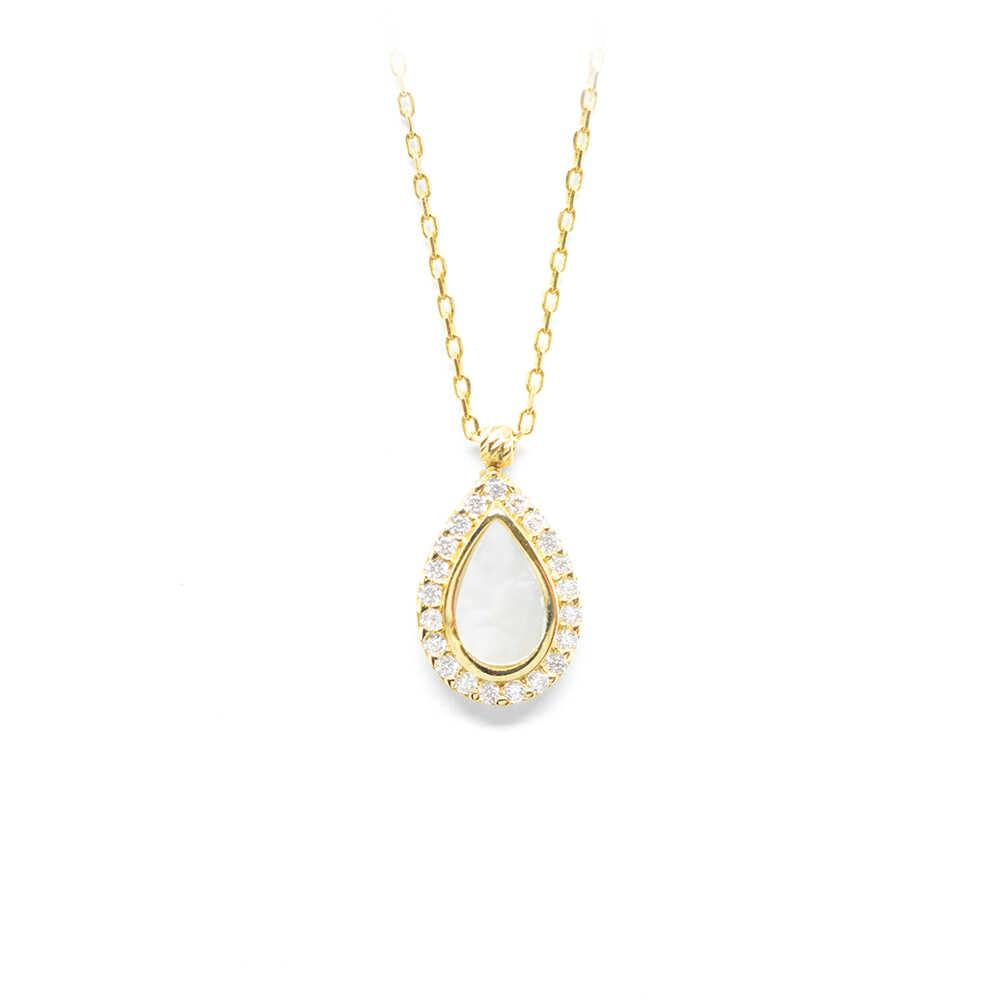 K14 yellow gold necklace with chain and pendant in drop shape cut from mother of pearl and cubic zirgons. Ideal for timeless elegant chic looks.