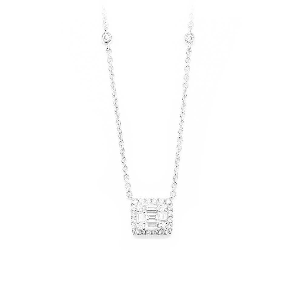 K18 white gold necklace in a refined design with a bright frame geometric motif and brilliant cut diamonds and baquettes. It stands out for its magnificent chain adorned with solitaire diamonds that uniquely flatters the neck. A jewel ideal for layering and elegant chic looks. WEDDING COLLECTION