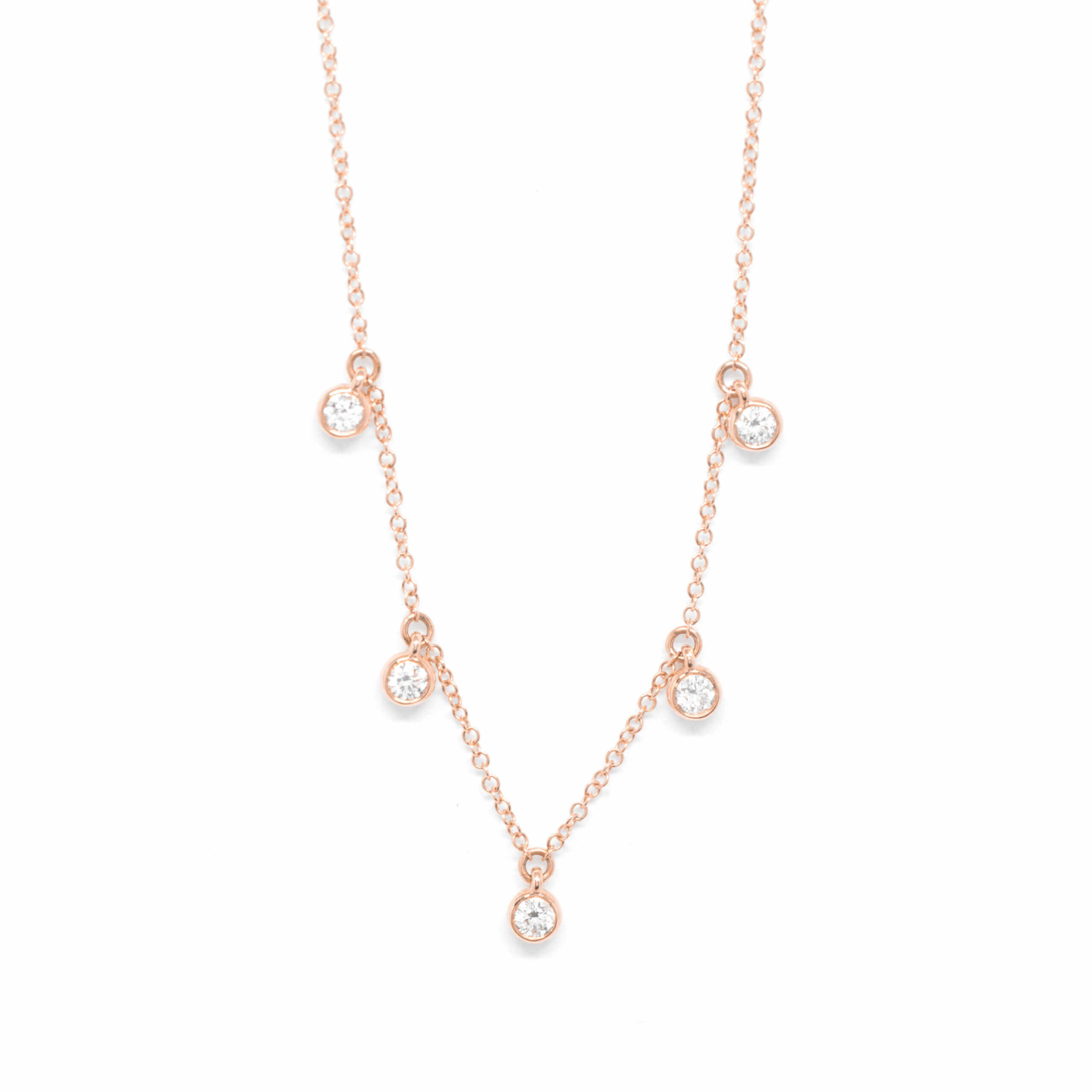 K18 rose gold necklace in a minimal design with repeated hanging brilliant cut diamonds. Ideal for layering and all day elegant chic looks. It can also be worn as a choker. Brilliants' total 0.20ct.