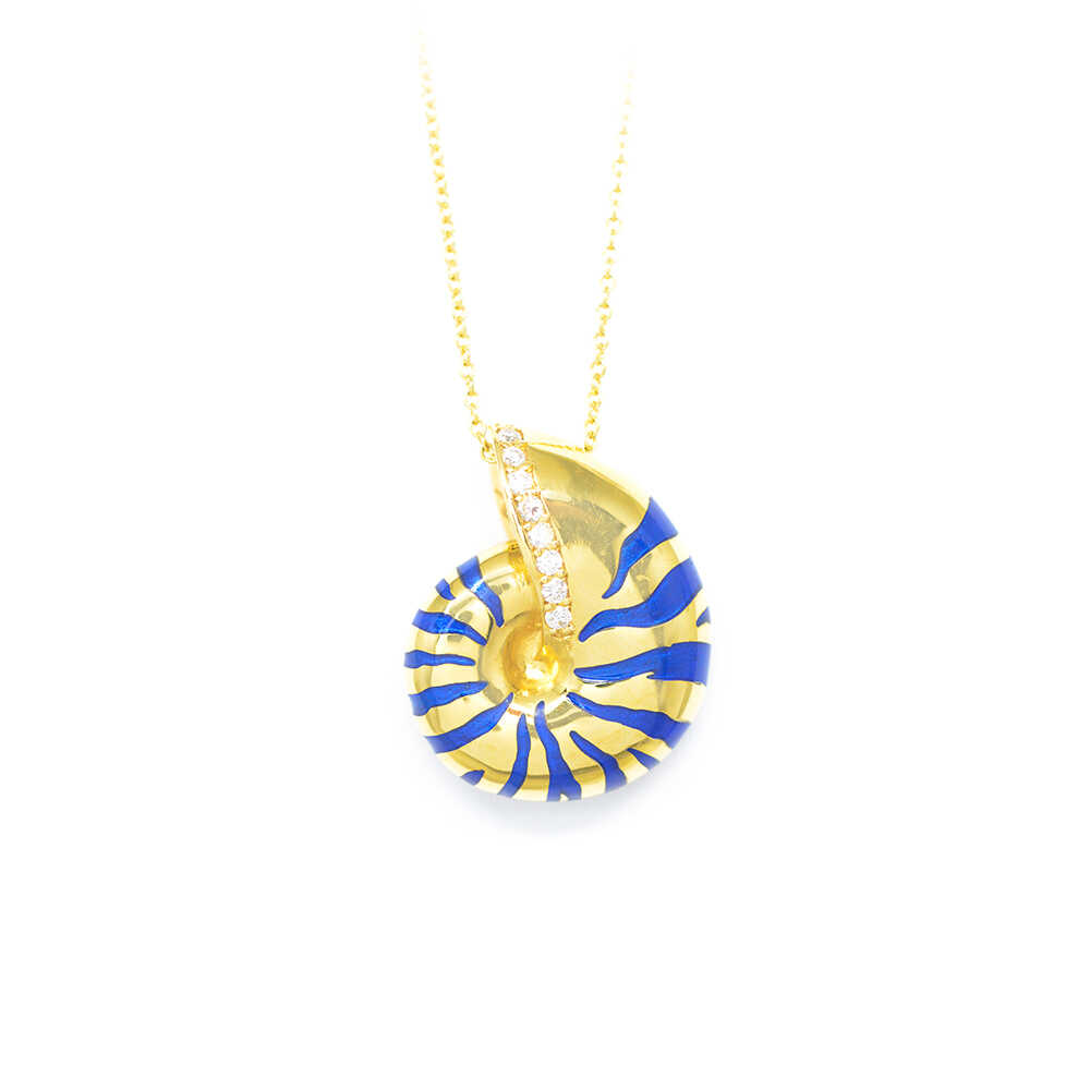 18k yellow gold shell necklace with diamonds and enamel