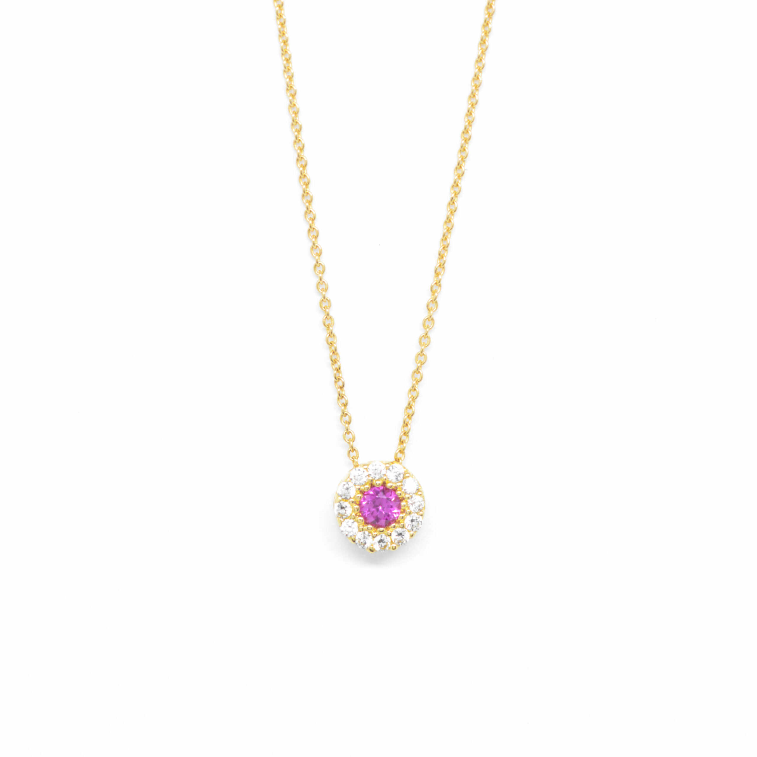 K14 yellow gold necklace with a chain and a patative rosette with a wonderful shine of cubic zirgons and a red ruby. Ideal for layering and timeless elegant chic looks.
