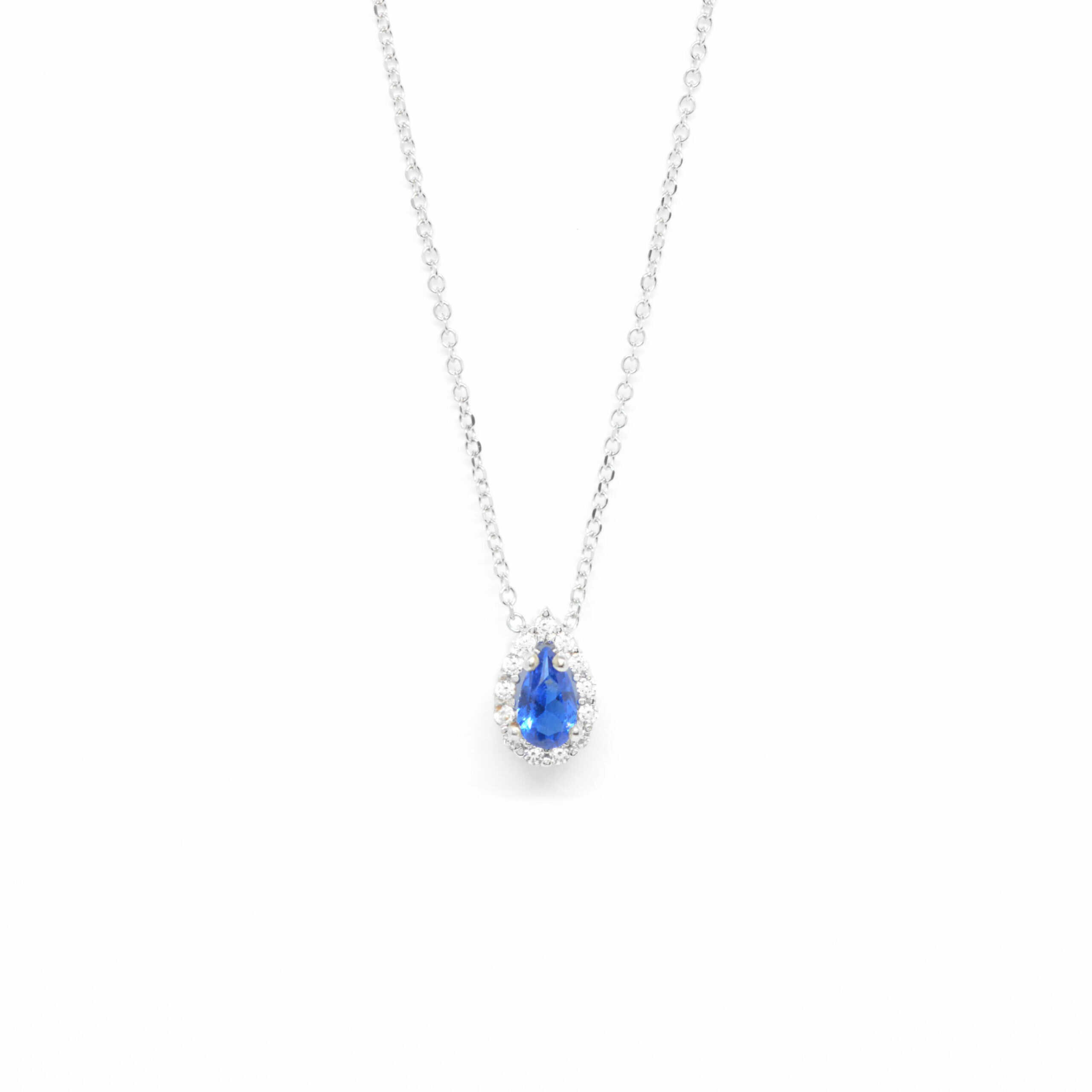 K14 white gold necklace with a chain and a drop-shaped rosette with a wonderful sparkle of cubic zirgons and blue sapphire. Ideal for layering and timeless elegant chic looks.