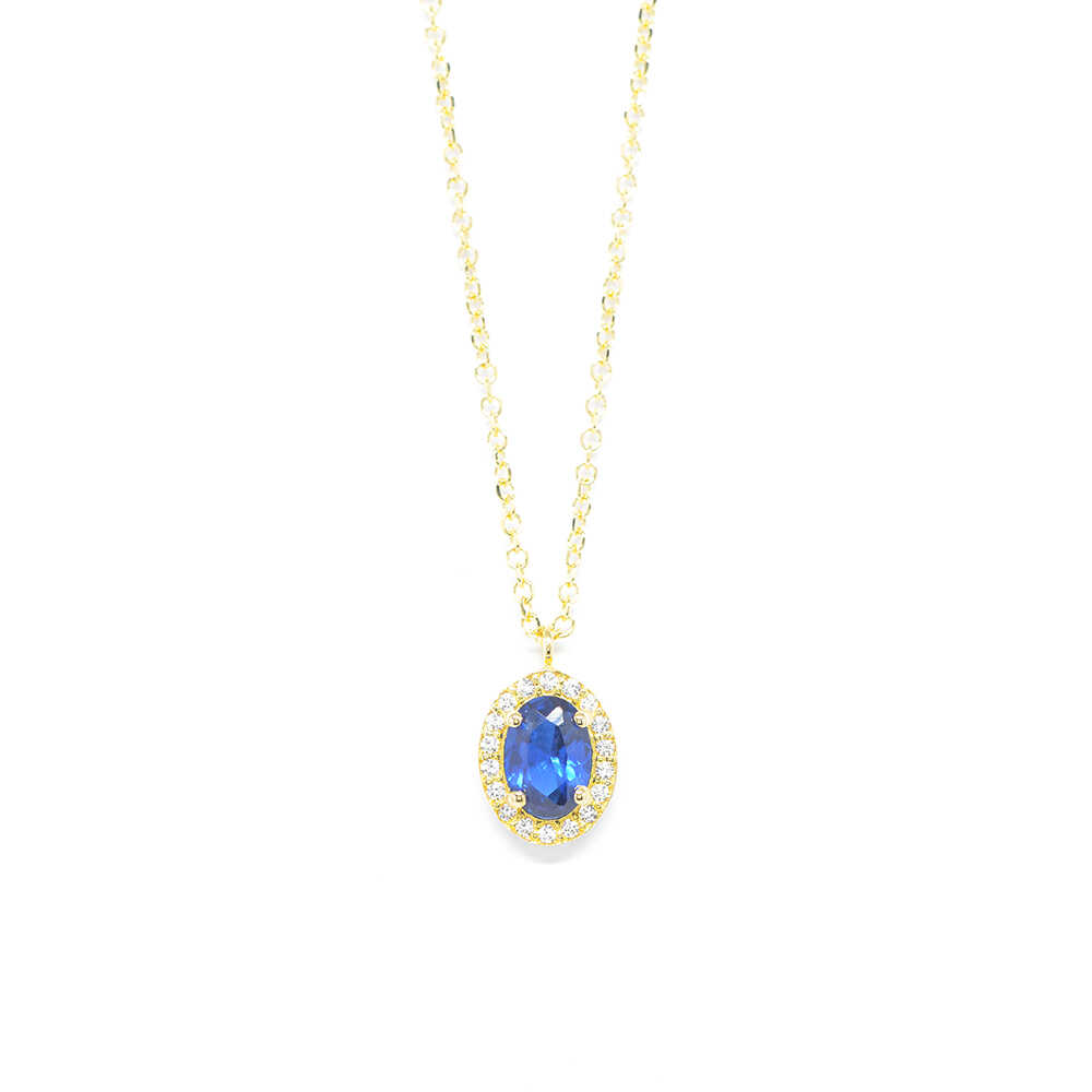 K14 white gold necklace with a chain and oval rosette in a classy design with a wonderful shine of cubic zirgons and blue sapphire. Ideal for timeless elegant chic looks.