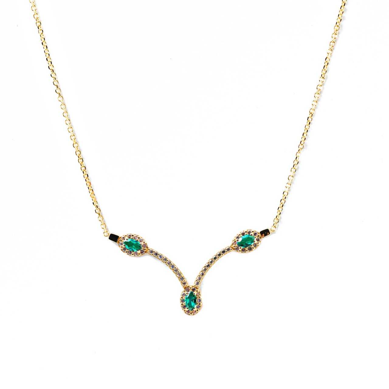 Necklace-necklace in yellow gold K14 and elegant design with extremely bright details of art deco motifs with white and green cubic zirgons. Ideal for timeless sophisticated looks. Wedding Collection