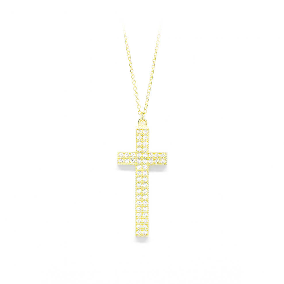 K14 yellow gold necklace with a chain and a cross in a geometric shape with a shiny detail of cubic zirgons. Ideal for layering and everyday urban chic looks.
