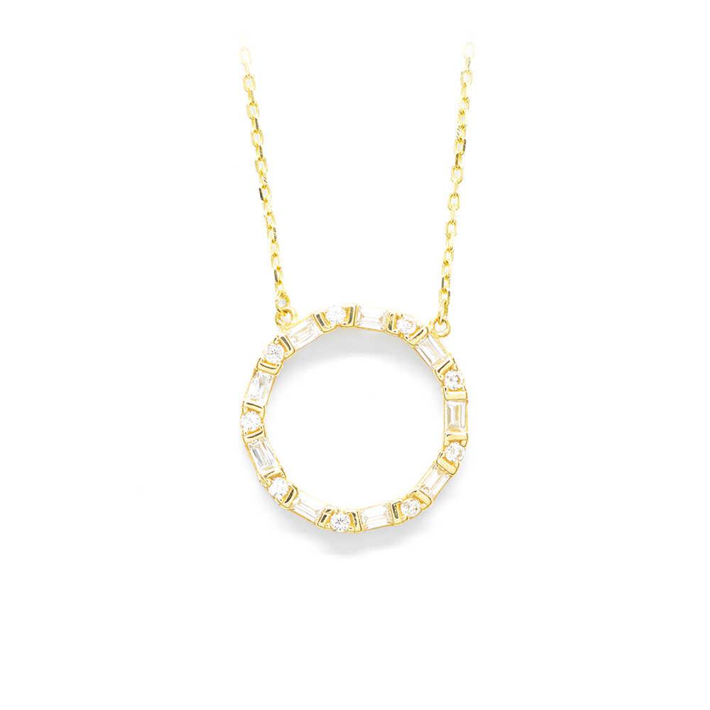 K14 yellow gold necklace with chain and pendant in modern elegant design and elliptical shape and shine from white cubic and baquet zirgons. Ideal for timeless and urban chic looks.