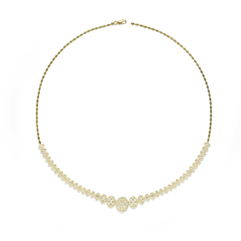 Necklace-necklace in yellow gold K14 and elegant design with extremely shiny details of oval classy motifs with cubic and baguette zirgons and finishing in a particularly feminine gradient line. Ideal for timeless sophisticated looks. Wedding Collection