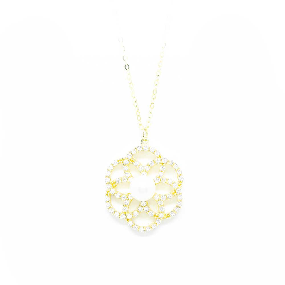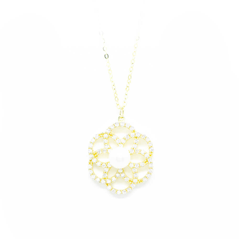 K14 yellow gold necklace with a chain and a flower pattern in a classy design with a wonderful sparkle of cubic zirgons and natural pearl. Ideal for timeless elegant chic looks.