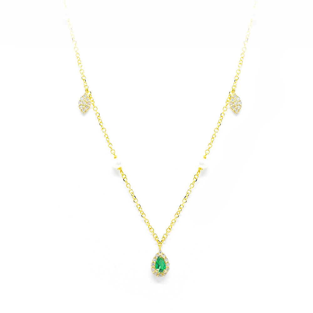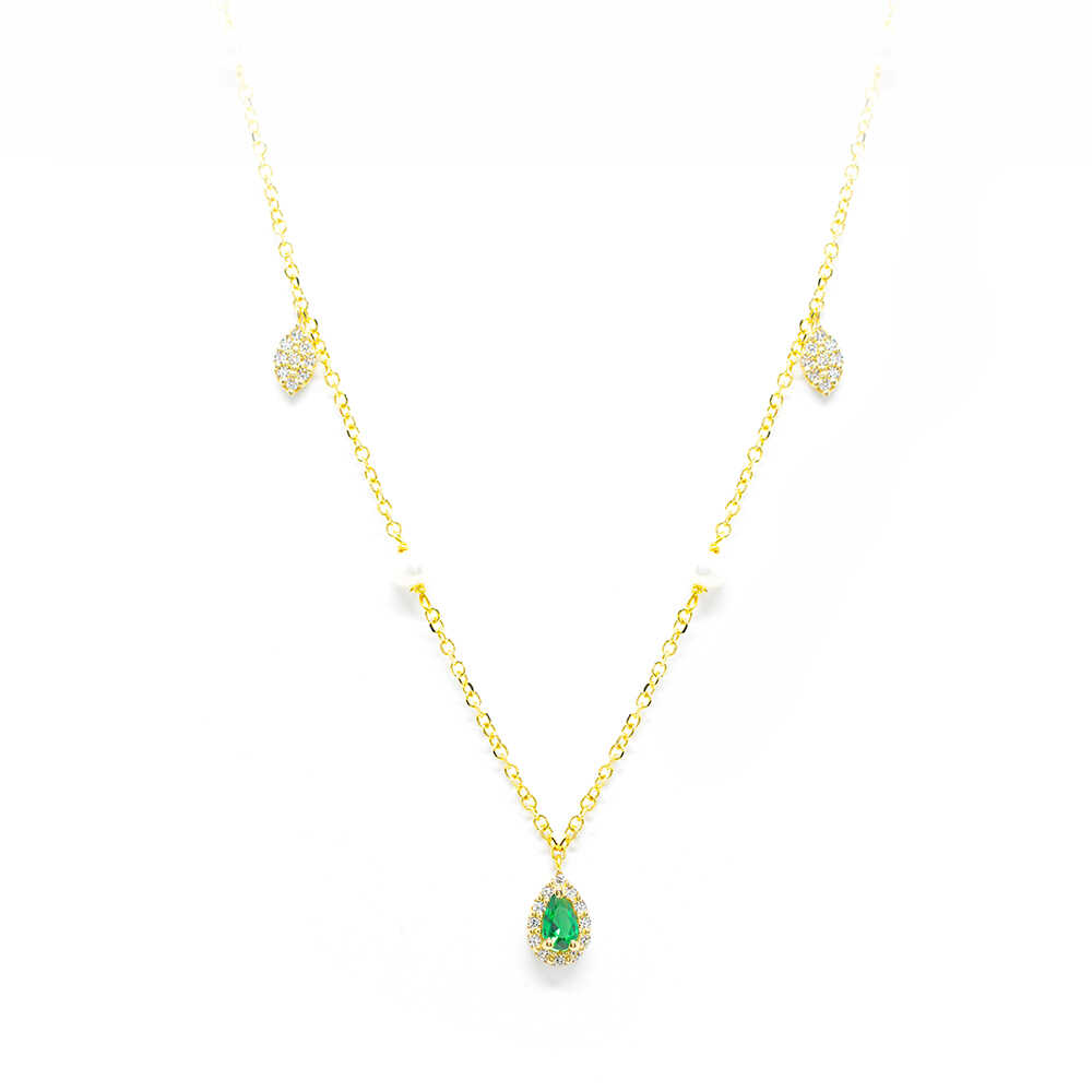 K14 yellow gold necklace in a minimal design with repeated motifs with natural pearls and separate shiny details of rosettes with green and white cubic zirgons. Ideal for layering and all day elegant chic looks.