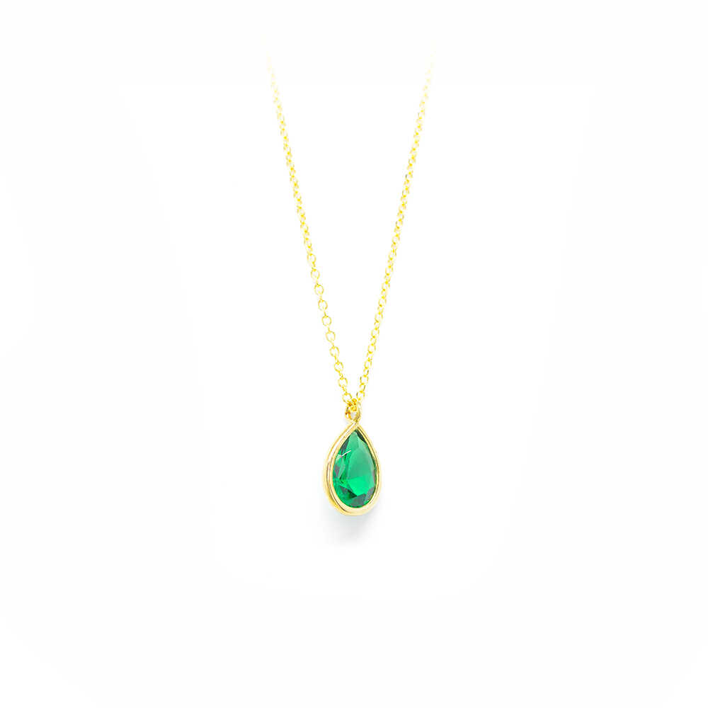 K14 yellow gold necklace with chain and green zirgon single stone in drop shape cut and minimal design. Ideal for timeless elegant chic looks.