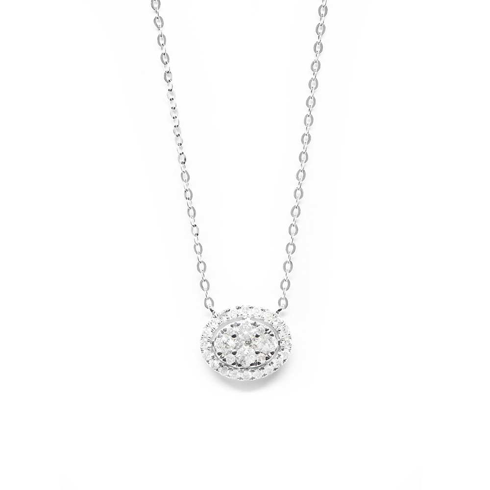 K18 white gold necklace in a sophisticated design with a shiny motif in a distinct oval shape and brilliant-cut diamonds and baquettes in invisible nailing that gives a uniquely impressive effect. A jewel ideal for layering and elegant chic looks. Brilliants' total 0.41ct. WEDDING COLLECTION
