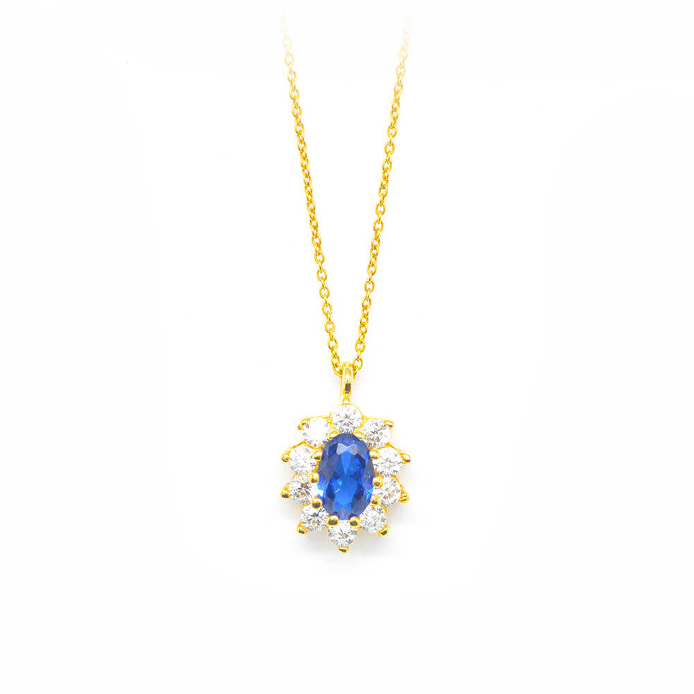 K14 yellow gold necklace with chain and patative rosette in a classy design with a wonderful shine of cubic zirgons and blue cubic zirgon in an oval shape in the center. Ideal for timeless elegant chic looks.