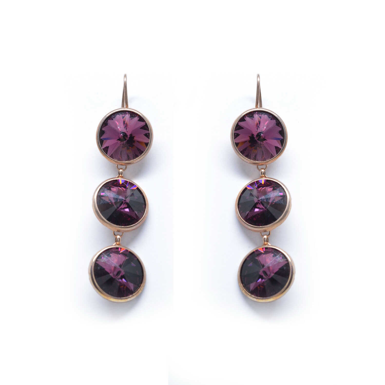 Silver pendant earrings with K18 rose gold plating and colored mineral stones in an elegant style. Purple crystal quartz and java clasp