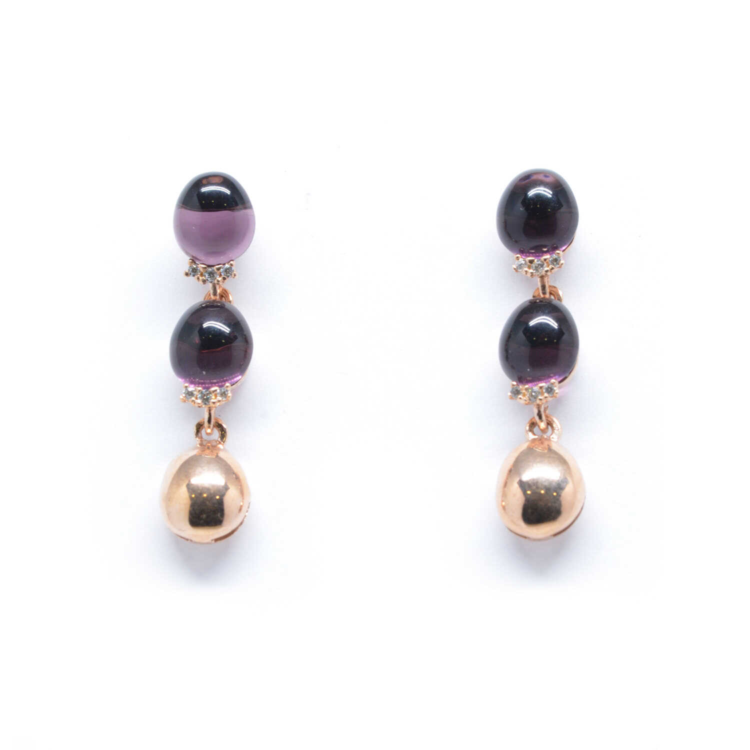 Dangling silver earrings with K18 rose gold plating and colored mineral stones in an elegant chic style. Purple amethyst quartz in a cabochon cut and a pyrro clasp