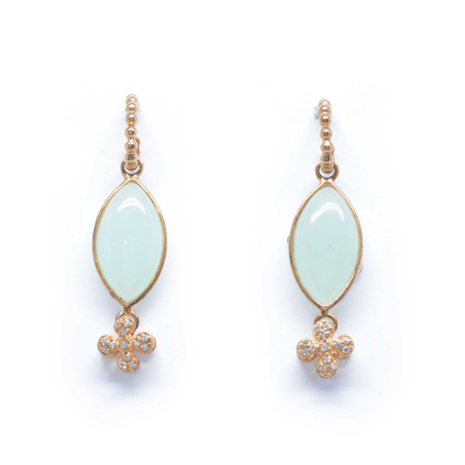 Silver pendant earrings with K18 rose gold plating and colored mineral stones in an elegant chic style. Milky quartz bezel and pyrrhotite clasp