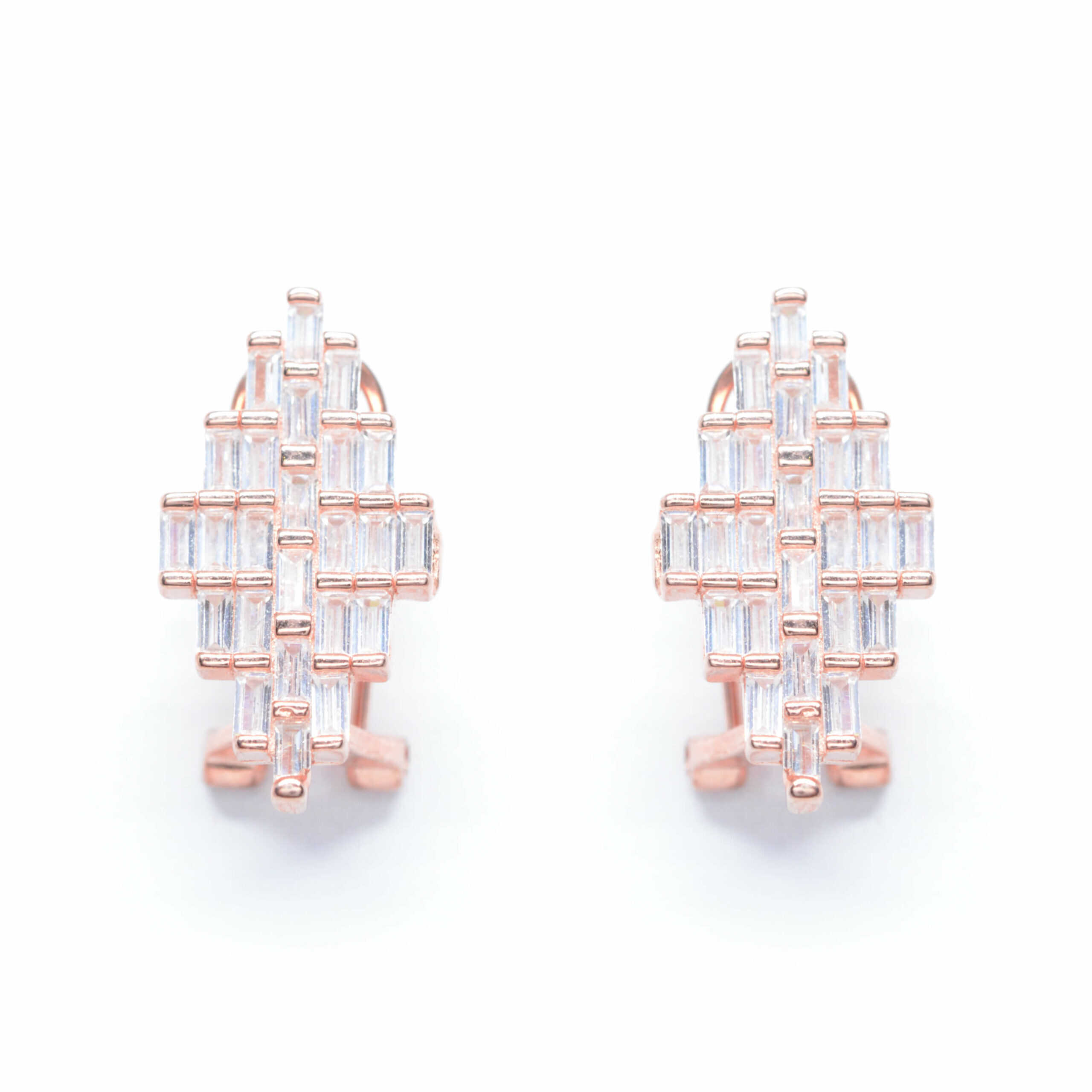 Silver earrings on the ear with K18 rose gold plating in an elegant style. Baguette-shaped cubic zirgons and clip fastening.