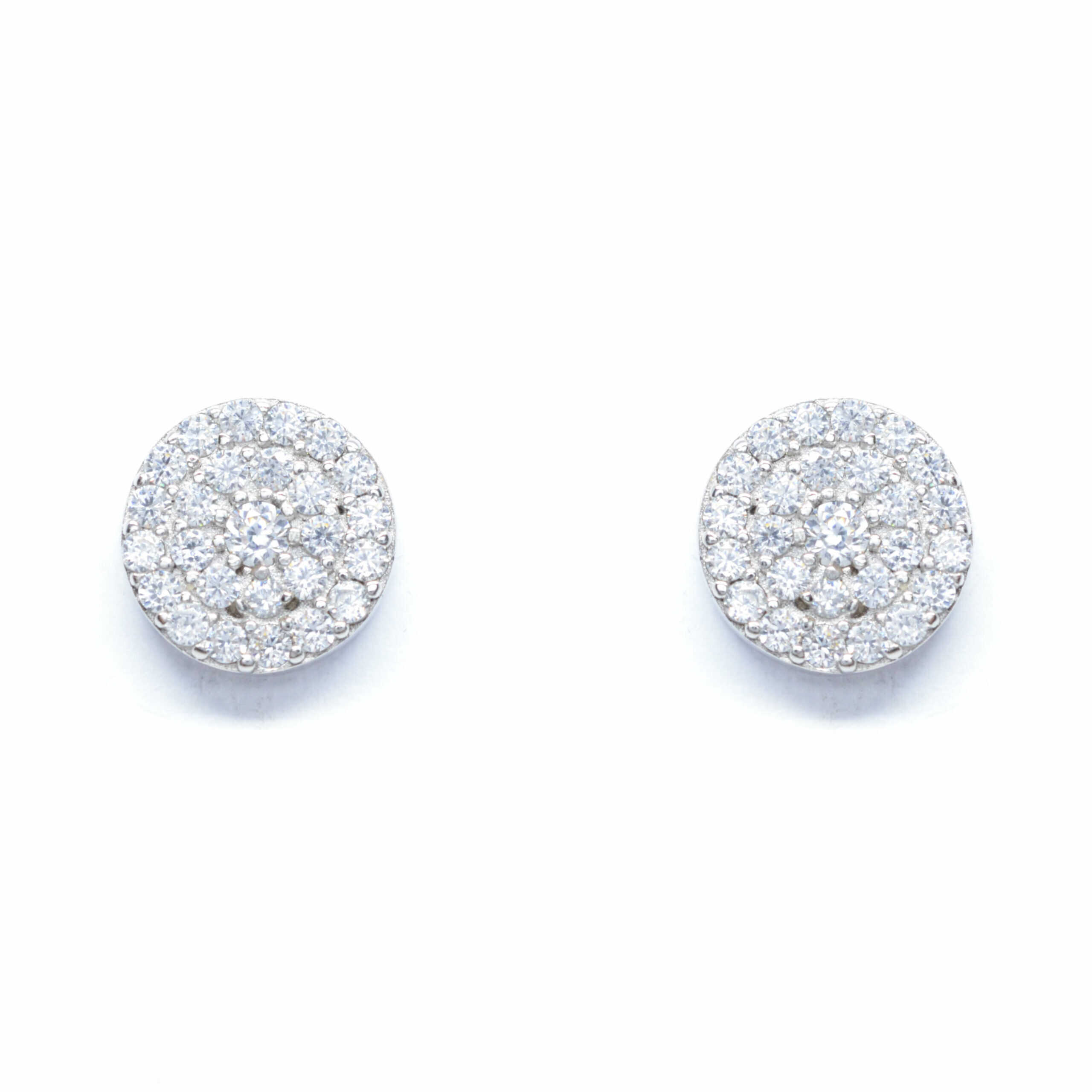 Silver rosette earrings on the ear in an elegant style. Cubic zirgons and pin buckle