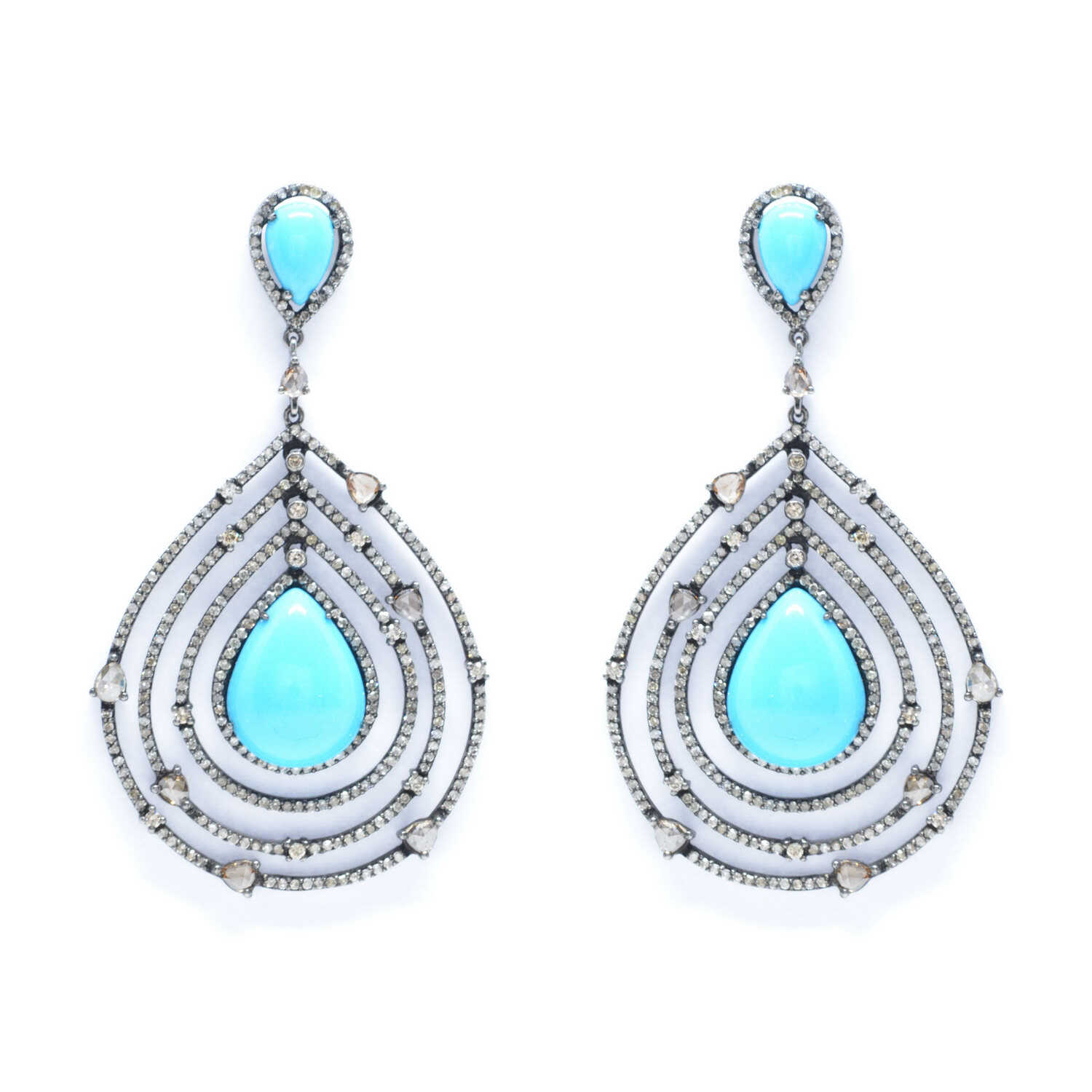 Gold and silver dangle earrings in exquisite art deco design with turquoise minerals and diamonds. Turquoise 2.68ct Diamonds 4.24ct.
