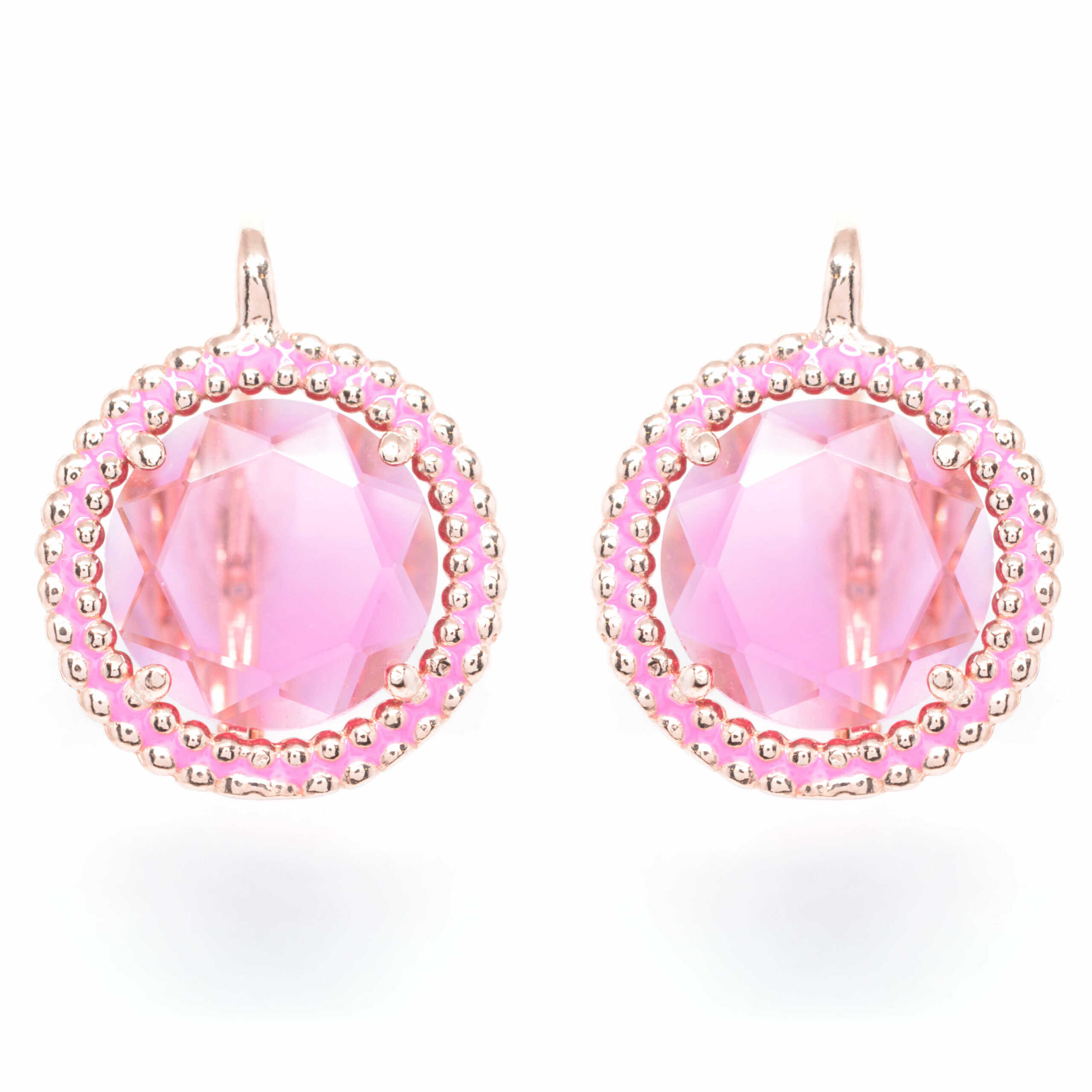 Earrings made of silver 925 in rose gold plating K18 with impressive round motifs of crystal quartz in bright pink color giving a vintage and refined style. Ideal for all day chic looks.