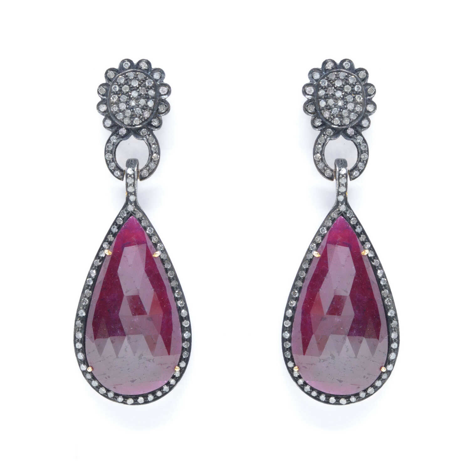 Gold and silver earrings hanging in an exquisite art deco design with red rubies and diamonds. Diamonds 1.68ct. Rubins 31.17ct.