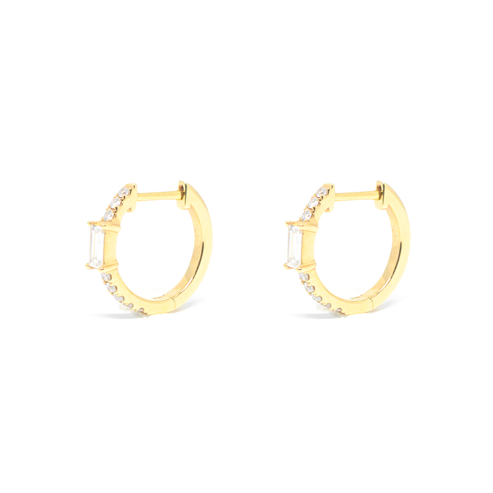K18 yellow gold hoop earrings and modern chic aesthetic design with brilliant and baguette cut diamonds creating an impressive piece of jewelry Ideal for all day elegant unique looks that will give you a style of luxury. Brilliants total 0.24ct. Wedding Collection.