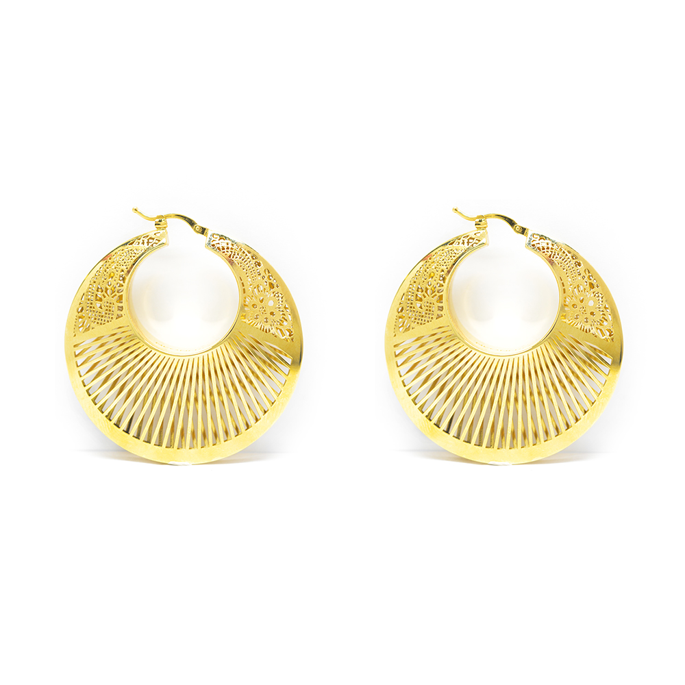 Hoop earrings in 14k yellow gold bull puffed and exquisite craftsmanship that gives a very shiny finish in an imposing design with perforate details and carving A pair of earrings of timeless value with an urban chic style that will highlight with their shine your everyday look.