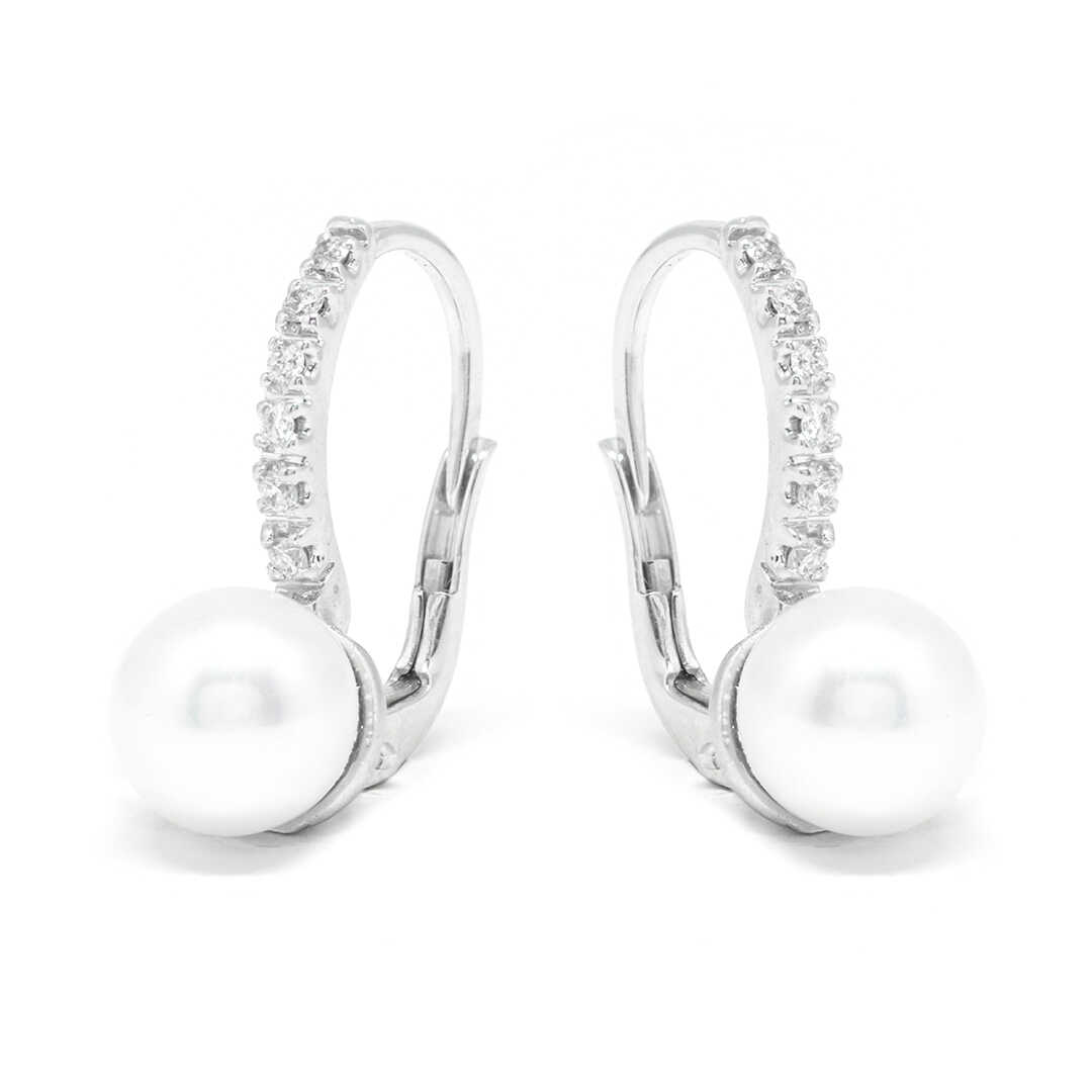 White gold earrings in an all time classic design with pearl and brilliant cut diamonds. Brilliants 0.05ct, natural pearl 8.00mm. Ideal for sophisticated everyday and timeless glamorous evening looks.