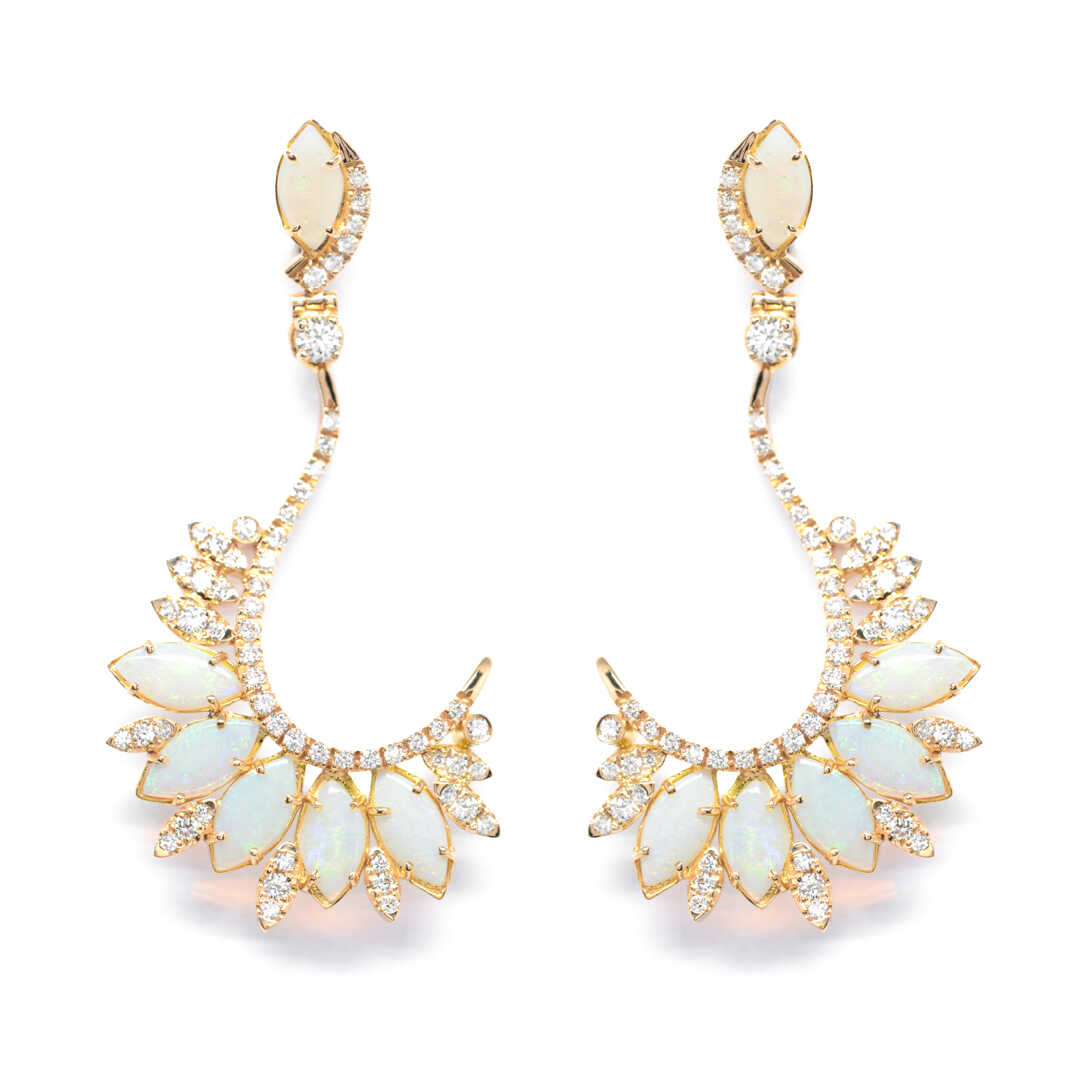 Yellow gold earrings in an avant garde aesthetic with brilliant cut diamonds and white opalines Brilliants 1.23ct. A pair of exquisitely designed earrings for elegant chic looks.