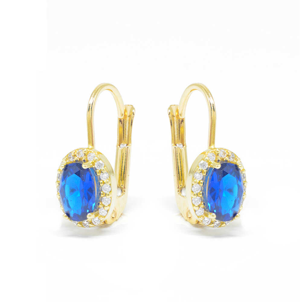 Yellow gold rosette earrings in an all time classic design and oval shape with white cubic zirgons and blue sapphire. Ideal for all day chic looks.