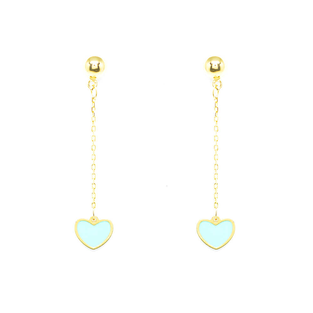 Yellow gold pendant earrings with a chain and a unique heart finish with turquoise enamel. Ideal for all day chic and girly looks.